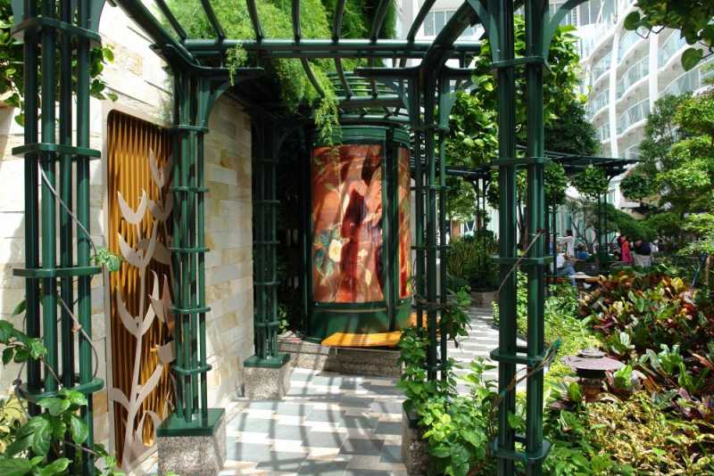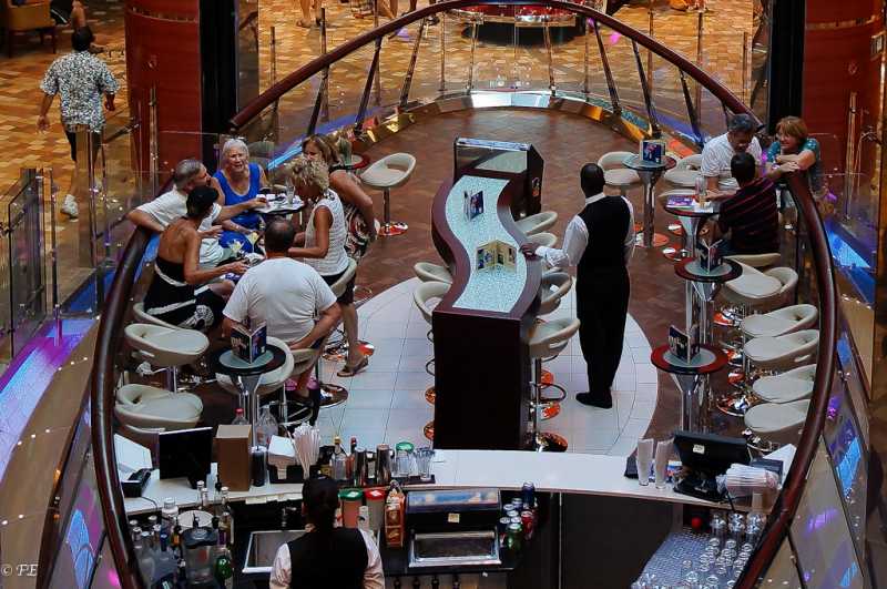 Otro de las cosas mas fotografiadas de las que conforman la Promenade del Allure es sin duda el Rising Tide Bar, un bar que flota arriba y abajo entre las cubiertas que van de la 5 a la 8, es decir desde Promenade hasta Central Park; como os digo hay cantidad infinita de imágenes, la gran mayoría lo muestran como parte importante de la Promenade, en estas que pongo se pueden apreciar más detalles.