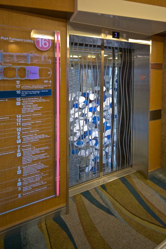 Jacob Hashimoto presenta una instalación compuesta por alrededor de 2100 discos pintados, que colocados de forma aleatoria y girando en 146 varillas de acero inoxidable nos ofrecen un paisaje cambiante; cada vez que subamos o bajemos por los ascensores de esa zona o simplemente mirando a través de las puertas de cristal de los elevadores veremos algo diferente. Jacob Hashimoto y su equipo emplearon 3 semanas a bordo del Allure para dar forma a esta creación que denominaron: "Puerta de entrada a la parte oculta del Cielo".