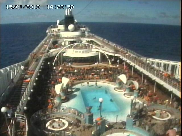 Igual con las cámaras de la pileta y supuestos que empiezan a hacer todo el tiempo. "No se ve gente de noche en la cubierta...será que lo cerraron o no los dejan salir?"...hubo una noche o más de una en la que había demasiado viento y las puertas permanecían cerradas por el fuerte viento y lluvia que toco después de Río.