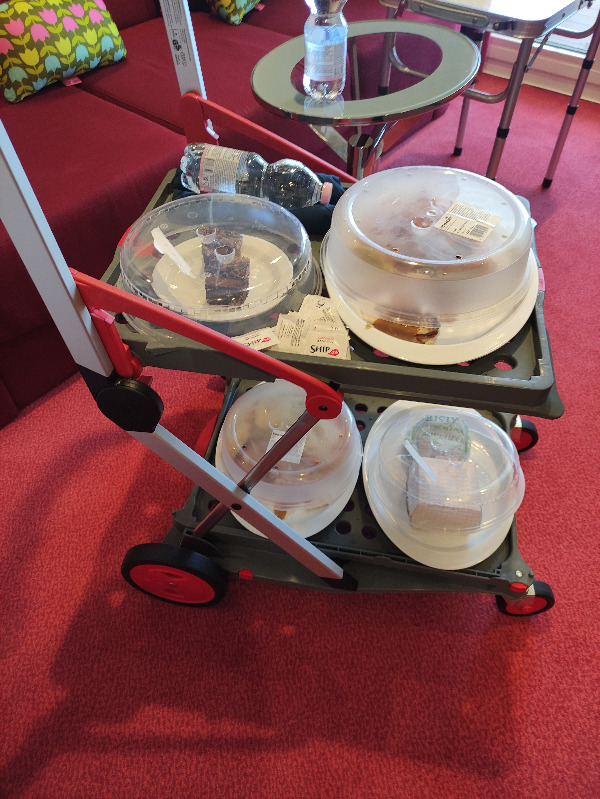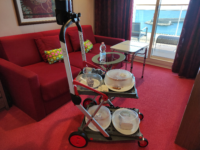 Nosotros no hemos ido ningún día al Restaurante principal. Sufro de Hernia de Hiato y me va fatal caminar después de las comidas, así que hace años decidimos desayunar, comer y cenar siempre en el camarote. Por eso siempre que podemos elegimos camarotes grandes para tener un poco más de espacio y estar más cómodos. Con el tiempo hemos ido perfeccionando la técnica y ahora ya nos llevamos un par de mesas plegables de casa y en este crucero hemos estrenado a Mary Horense, nuestra camarera de Buffet, que ha sido un éxito total y absoluto