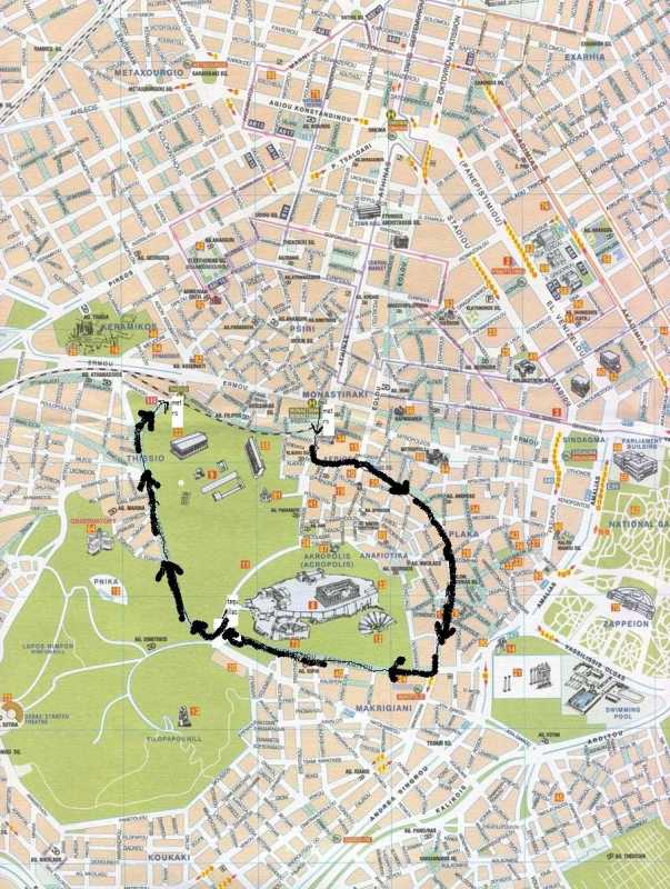 Tengo pensado ir en la linea 1 hasta Monastiraki, que es la siguiente parada despues de Thisios, despues ir callejeando hasta el barrio de Plaka, visita de Plaka y acontinuacion continuar por la avenida Dionissiou Areopagitiou, hasta encontrar las taquillas, visita de la Acropolis, y seguir por la avenida Apostoulou Pavlou hasta cojer el metro en Thisios y vuelta al puerto, con tiempo suficiente para no llegar muy justitos de tiempo, todo esto teniendo en cuenta que vamos con unos peques de tres años, llevaremos la sillita de paseo, pero en la Acropolis ya veremos como nos lo montamos.